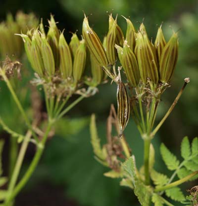 van de vruchten van de roomse kervel. De 2,5cm lange vruchten zijn groen geribbeld en lijken op mini augurkjes. |