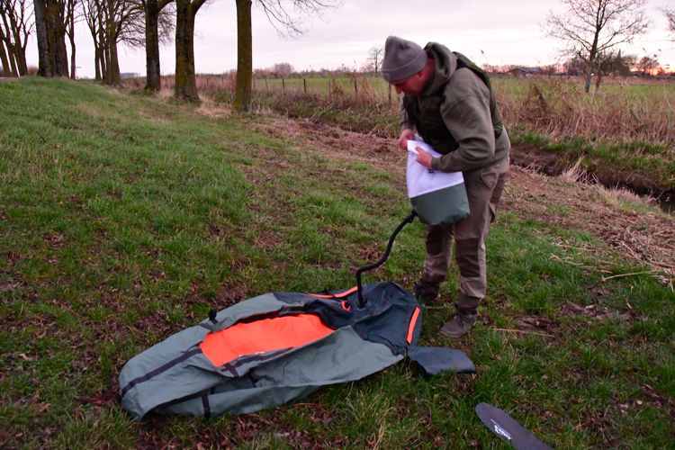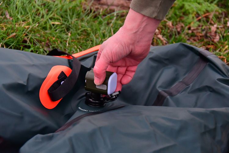 De transportzak is een luchtdichte zak die de kunt gebruiken om er lucht mee in de packraft te krijgen, je zorgt dat de zak vol lucht is en sluit hem aan de bovenzijde door de opening dicht te vouwen. Vervolgens pers je de lucht uit de zak welke via het slangetje in het ventieltje van de packraft loopt. In minder als 5 minuten heb je de hele packraft volledig gevuld met lucht.
