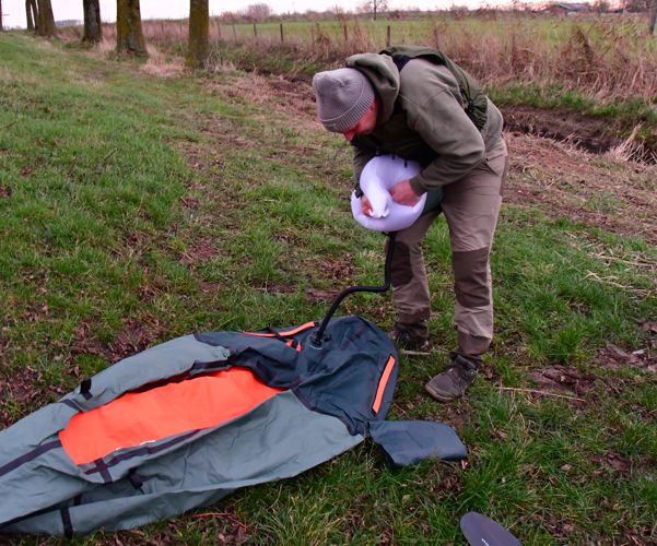 Heb je geen zin om al deze moeite te doen, dan kun je een kleine usb oplaadbare compressor gebruiken waarmee je de packraft kunt opgeblazen. Hieronder zie je hoe dat er in de praktijk uitziet.