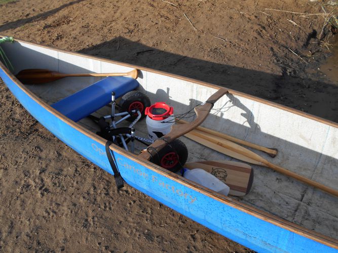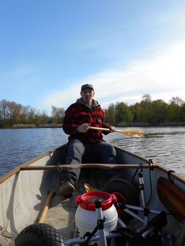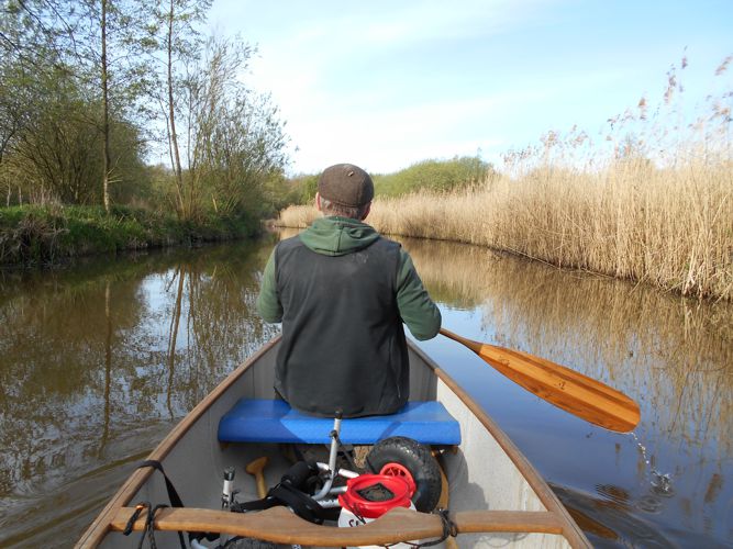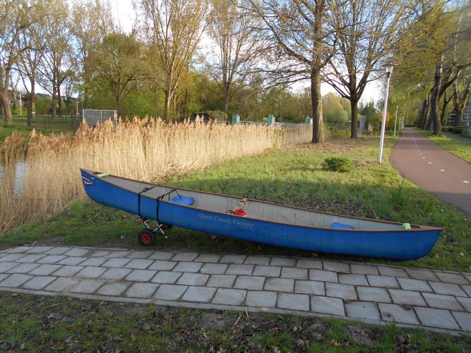 Op het afwateringskanaal kom je een stuw tegen waardoor we met de kano moeten uitstappen en de kano over 150 meter moeten overdragen. Omdat Geert herstellende is van een hernia leek het ons beter om de kano met een speciaal karretje te transporteren.