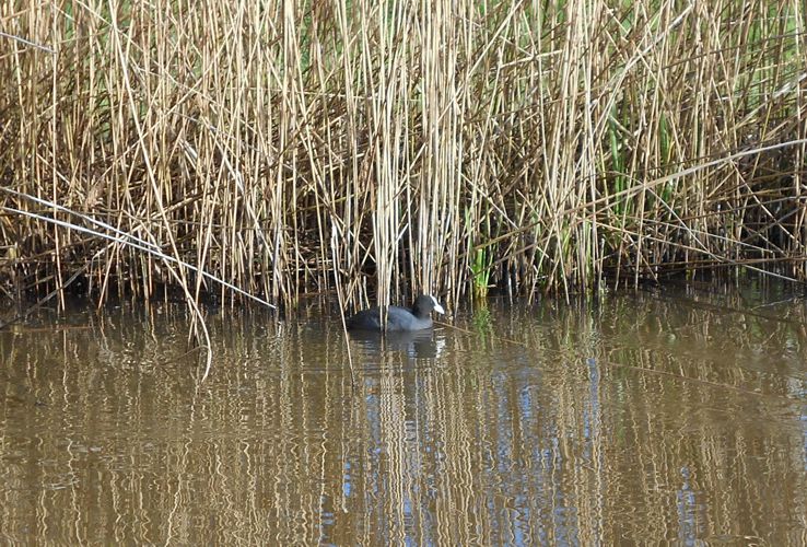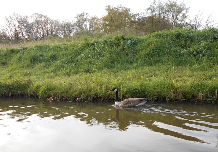 In de rietkraag komen we verschillende meerkoeten tegen, ik heb nog geen nesten van ze gezien. Deze vallen altijd goed op want het zijn drijvende nesten. Op de oever zit her en der een koppeltje ganzen te broeden, we zien twee ganzenkuikens langs de kano af zwemmen.
