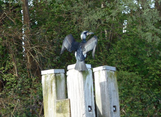 Terug in de haven van het Beatrixkanaal zien we een aalscholver op een paal zitten, de vogel kan een spanwijdte van wel 150cm bereiken. Dus wel indrukwekkend om hem van dichtbij te bewonderen.