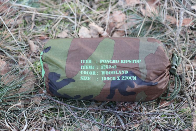 De militaire poncho varianten hebben allemaal ogen waar je eenvoudig een touwtje aan kunt maken om de poncho op te spannen of ergens aan vast te binden. Zitten er geen ogen in de poncho dan kun je een steentje of een dennenappel in de poncho stoppen en er dan een touwtje omheen binden zodat de poncho niet scheurt. Span de poncho aan de zijde waar de wind vandaan komt zo blijf je droog als het gaat regenen.