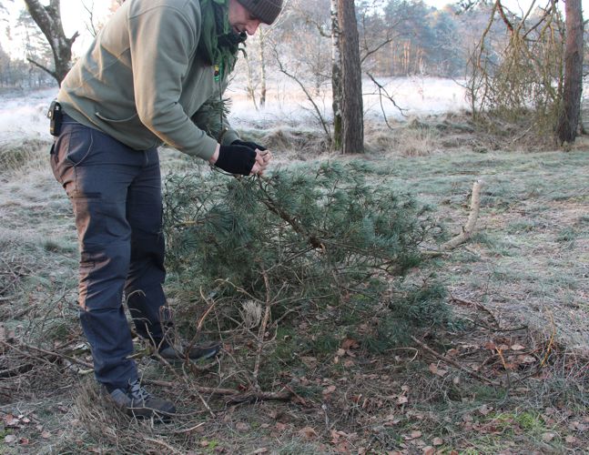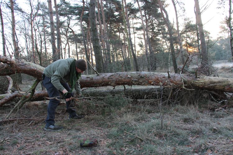 Er lagen nog veel dode takken en dennenappels op de plaats waar mijn schuilonderkomen moet komen, het is het makkelijkst als je dit verwijderd voordat je met het bouwen van je onderkomen begint.