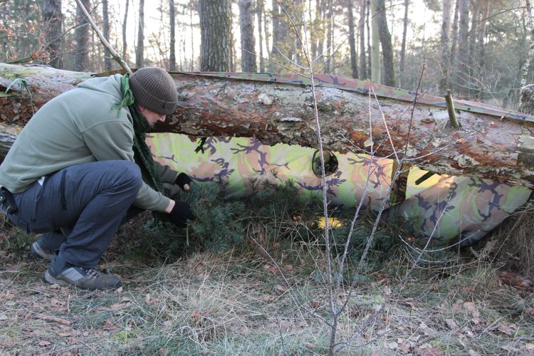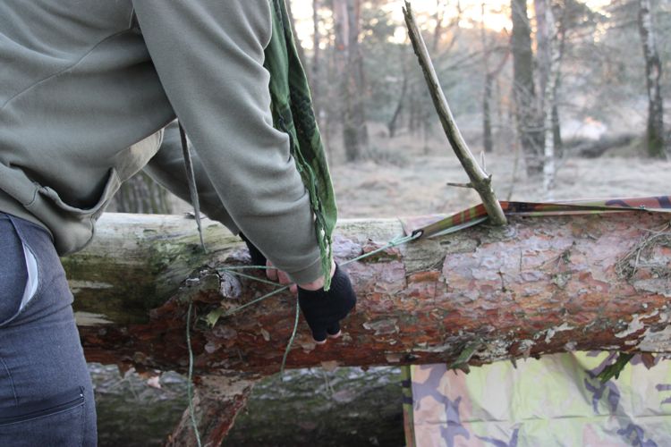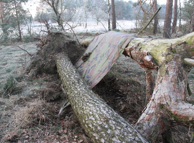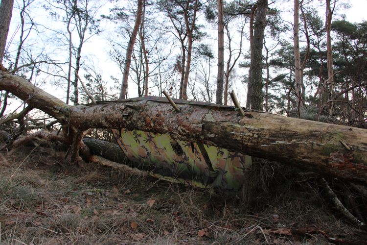 Ik vind het altijd leuk om verschillende schuilonderkomens te maken, ik kwam twee omgewaaide bomen tegen waarvan één op de grond lag en de andere nog op een dikke tak steunde. Dit leek me een mooie plek om er met behulp van een poncho een schuilonderkomen van te maken.