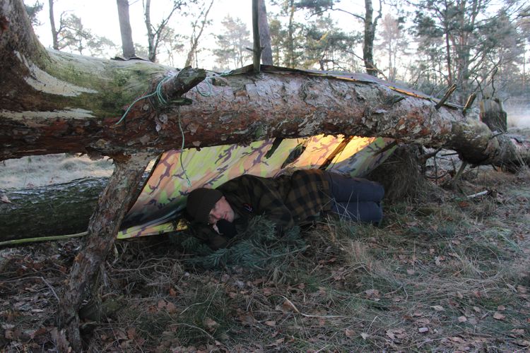 In een echte survival situatie kun je een klein vuurtje voor je schuilonderkomen maken zodat je warm blijft, kun je geen vuur maken (tactische omstandigheden) dan kun je ook een reddingsdeken uit je EHBO set gebruiken om jezelf zo warm mogelijk te houden. Je zult geen comfortabele nacht hebben maar het draait dan ook om in leven te blijven.