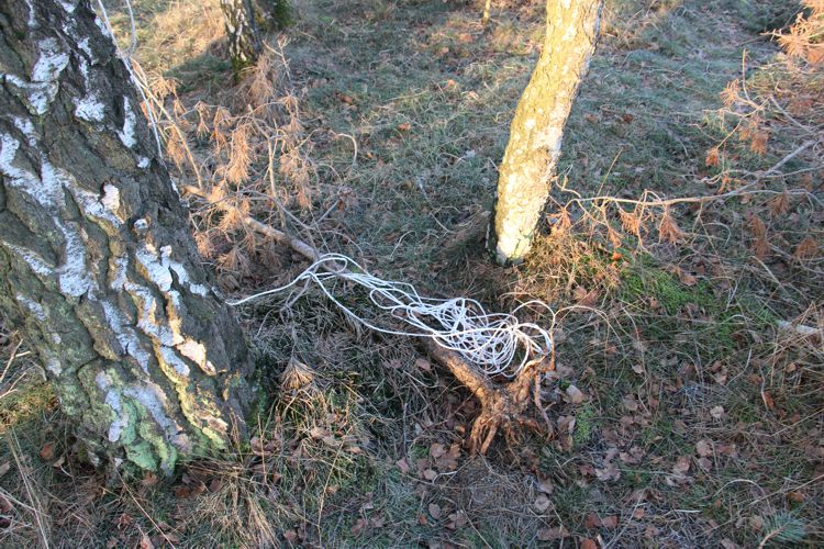 Tijdens mijn wandeling kwam ik verschillende stukken touw tegen, in een survivalsituatie neem je alles mee wat je in nood kan helpen om het overleven een stuk eenvoudiger te maken. Daarom heb ik de stukken touw meegenomen om ze mogelijk op een later tijdstip te gebruiken.